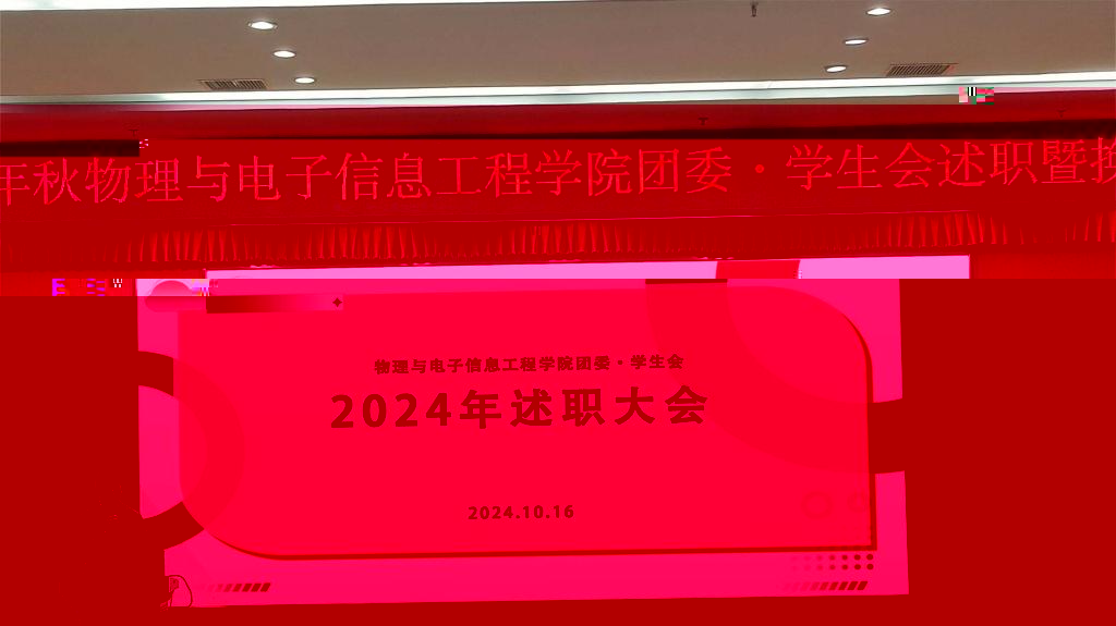 2024年10月16日晚,9728太阳集团首页團委·學生會在雁山校區圖書館報告廳舉辦了述職暨換屆大會。學院黨委副書記蔣瓊、學工組長黃嘉、團委書記姚倩、兼職輔導員李琪出席本次會議。本次大會旨在總結過去一段時間學生會的工作成果,明确未來的工作方向,同時加強各部門之間的交流與合作。